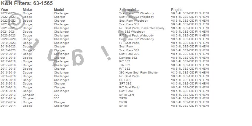 Below is an abbreviated list of applications for the 63 Series Aircharger Kit.300, Challenger, Charger, Chrysler, Dodge, 2019, 2018, 2017, 2016, 2015, 2014, 2013, 2012, 2011