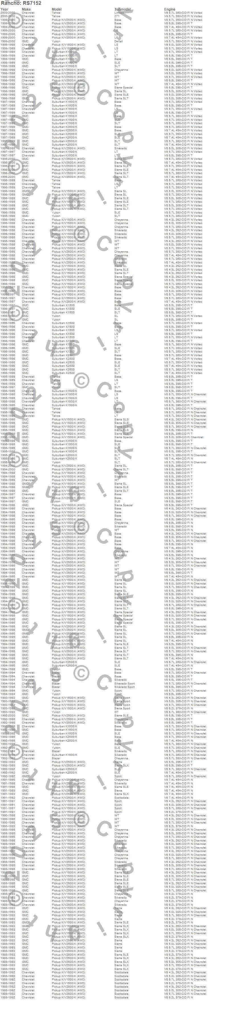 Below is an abbreviated list of applications for the RS7000MT Monotube Shock.BLAZER, K1500 PICKUP, K1500 SUBURBAN, K2500 PICKUP, K2500 PICKUP (Canadian), YUKON, CHEVROLET, GMC, 1999, 1998, 1997, 1996, 1995, 1994, 1993, 1992, 1991, 1990, 1989, 1988