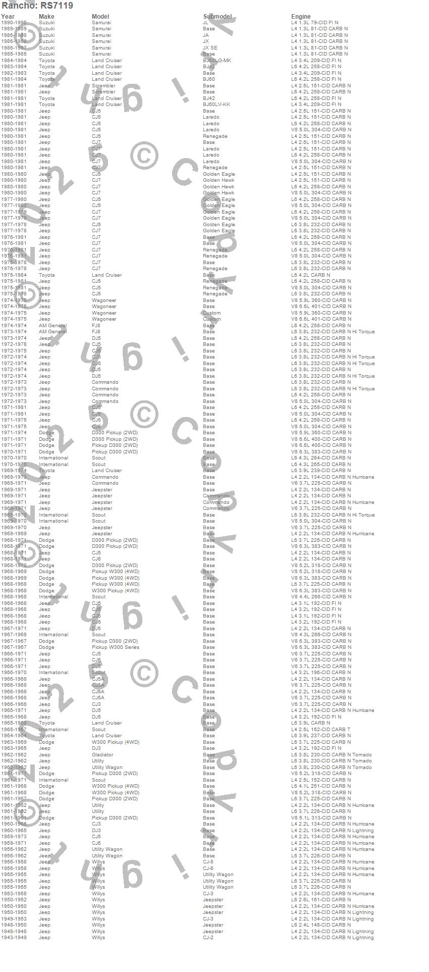 Below is an abbreviated list of applications for the RS7000MT Monotube Shock.CJ-2A, CJ-3A, CJ-3B, CJ5, CJ5 (Canadian), CJ6, CJ6 (Canadian), CJ7, COMMANDO, D300 PICKUP, D300 SERIES, DJ-3A, JEEPSTER, LAND ROVER, M38, M38A1, MB, SAMURAI, SAMURAI (Canadian), SCOUT