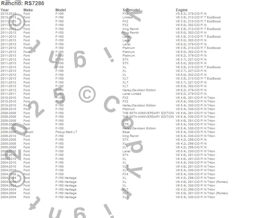 Below is an abbreviated list of applications for the RS7000MT Monotube Shock.F-150 PICKUP, F-150 PICKUP (Canadian), MARK LT, FORD, LINCOLN, 2010, 2009, 2008, 2007, 2006, 2005, 2004
