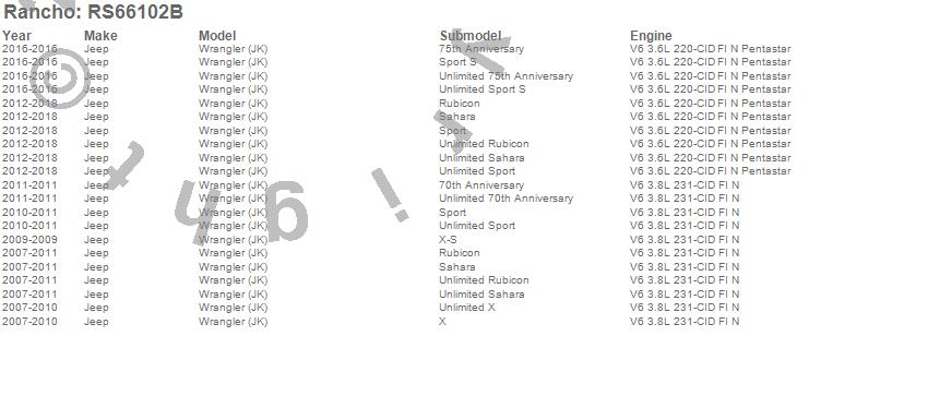 Below is an abbreviated list of applications for the Primary Suspension System.WRANGLER, JEEP, 2013, 2012, 2011, 2010, 2009, 2008, 2007