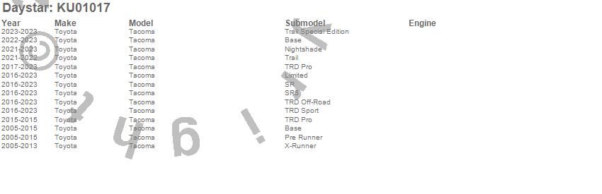 Below is an abbreviated list of applications for the Shock Absorber.Tacoma, Toyota, 2017, 2015, 2014, 2013, 2012, 2011, 2010, 2009, 2008, 2007, 2006, 2005