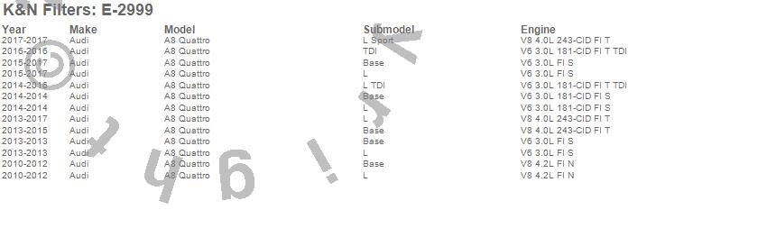 Below is an abbreviated list of applications for the Air Filter.A8 Quattro, Audi, 2017, 2016, 2015, 2014, 2013, 2012, 2011, 2010