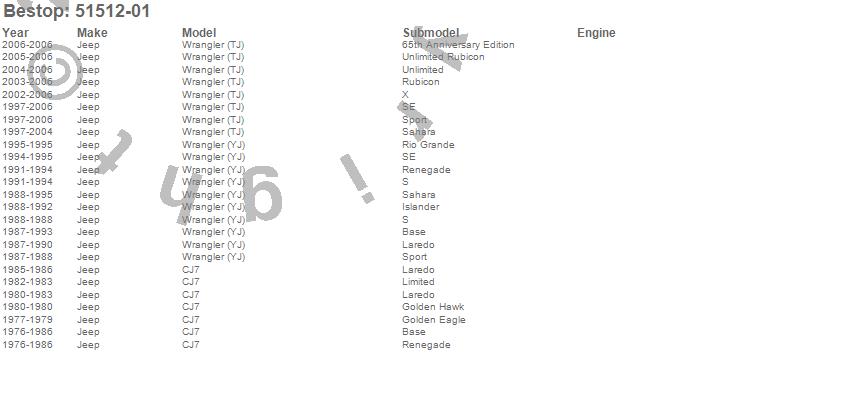 Below is an abbreviated list of applications for the Cargo Liner.CJ7, Wrangler (TJ), Wrangler (YJ), Jeep, 2006, 2005, 2004, 2003, 2002, 2001, 2000, 1999, 1998, 1997, 1995, 1994, 1993, 1992, 1991, 1990