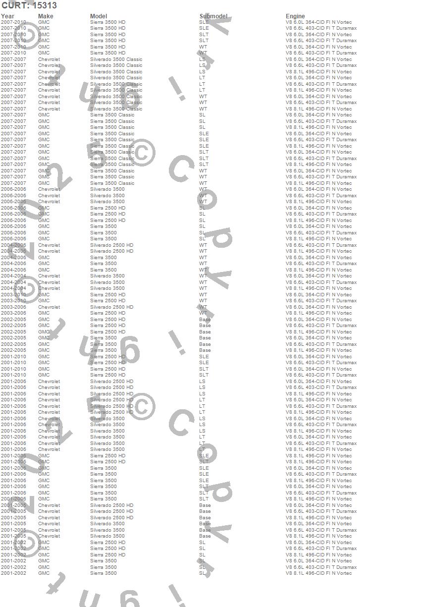 Below is an abbreviated list of applications for the Class V 2 in. Xtra Duty Hitch.Sierra 2500 HD, Sierra 3500, Sierra 3500 Classic, Sierra 3500 HD, Silverado 2500 HD, Silverado 3500, Silverado 3500 Classic, Chevrolet, GMC, 2010, 2009, 2008, 2007, 2006, 2005, 2004, 2003, 2002, 2001