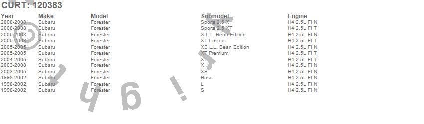 Below is an abbreviated list of applications for the Class II 1.25 in. Receiver Hitch.Forester, Subaru, 2008, 2007, 2006, 2005, 2004, 2003, 2002, 2001, 2000, 1999, 1998