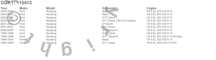 Below is an abbreviated list of applications for the Class I 1.25 in. Receiver Hitch.Mustang, Ford, 2004, 2003, 2002, 2001, 2000, 1999, 1998, 1997, 1996, 1995, 1994