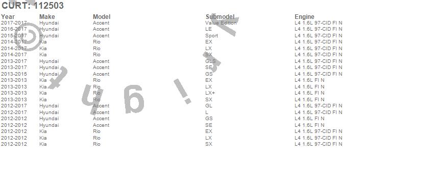 Below is an abbreviated list of applications for the Class I 1.25 in. Receiver Hitch.Accent, Rio, Hyundai, Kia, 2017, 2016, 2015, 2014, 2013, 2012