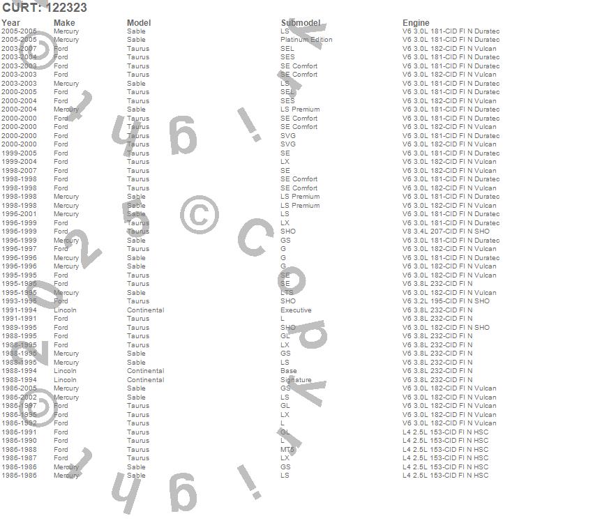 Below is an abbreviated list of applications for the Class II 1.25 in. Receiver Hitch.Continental, Sable, Taurus, Ford, Lincoln, Mercury, 2007, 2006, 2005, 2004, 2003, 2002, 2001, 2000, 1999, 1998, 1997, 1996, 1995, 1994