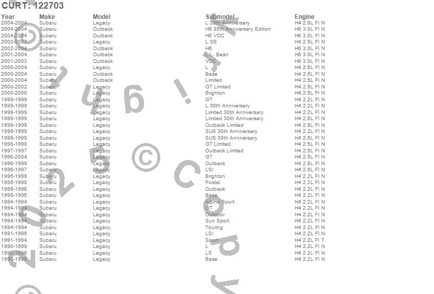 Below is an abbreviated list of applications for the Class II 1.25 in. Receiver Hitch.Legacy, Outback, Subaru, 2004, 2003, 2002, 2001, 2000, 1999, 1998, 1997, 1996, 1995, 1994, 1993, 1992, 1991, 1990