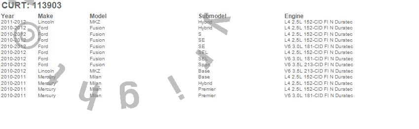 Below is an abbreviated list of applications for the Class I 1.25 in. Receiver Hitch.Fusion, Milan, MKZ, Ford, Lincoln, Mercury, 2012, 2011, 2010