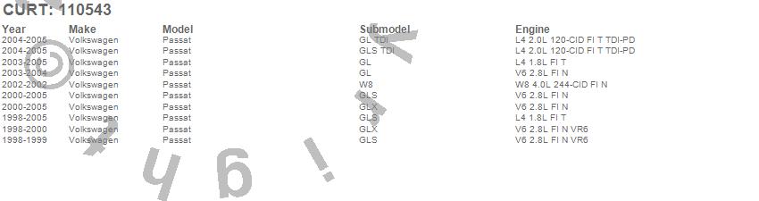 Below is an abbreviated list of applications for the Class I 1.25 in. Receiver Hitch.Passat, Volkswagen, 2005, 2004, 2003, 2002, 2001, 2000, 1999, 1998