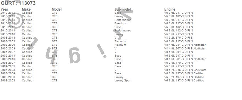 Below is an abbreviated list of applications for the Class I 1.25 in. Receiver Hitch.CTS, STS, Cadillac, 2013, 2012, 2011, 2010, 2009, 2008, 2007, 2006, 2005, 2004, 2003