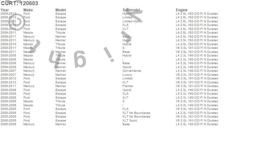 Below is an abbreviated list of applications for the Class II 1.25 in. Receiver Hitch.Escape, Mariner, Tribute, Ford, Mazda, Mercury, 2012, 2011, 2010, 2009, 2008, 2007, 2006, 2005