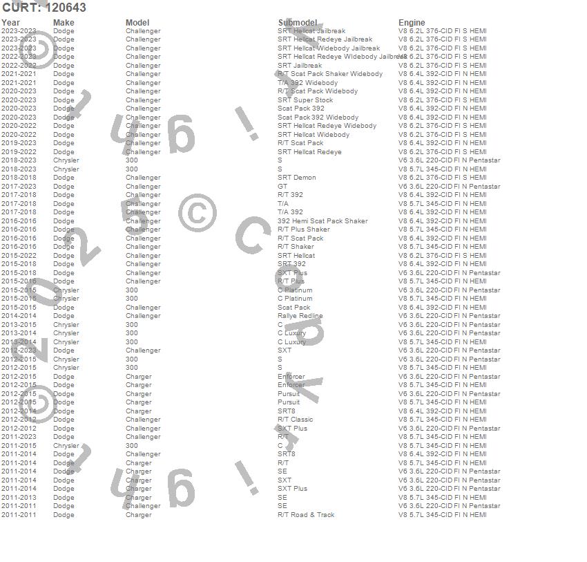 Below is an abbreviated list of applications for the Class II 1.25 in. Receiver Hitch.300, Challenger, Charger, Chrysler, Dodge, 2023, 2022, 2021, 2020, 2019, 2018, 2017, 2016, 2015, 2014, 2013, 2012, 2011