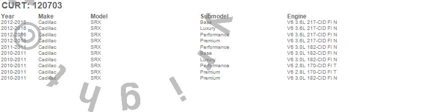 Below is an abbreviated list of applications for the Class II 1.25 in. Receiver Hitch.SRX, Cadillac, 2016, 2015, 2014, 2013, 2012, 2011, 2010