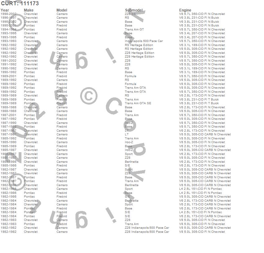 Below is an abbreviated list of applications for the Class I 1.25 in. Receiver Hitch.Camaro, Firebird, Chevrolet, Pontiac, 2002, 2001, 2000, 1999, 1998, 1997, 1996, 1995, 1994, 1993, 1992, 1991, 1990, 1989, 1988, 1987