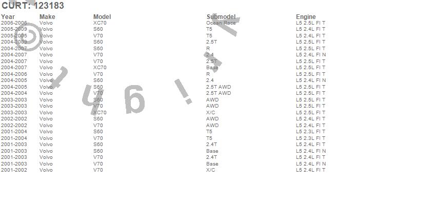Below is an abbreviated list of applications for the Class II 1.25 in. Receiver Hitch.S60, V70, XC70, Volvo, 2009, 2008, 2007, 2006, 2005, 2004, 2003, 2002, 2001