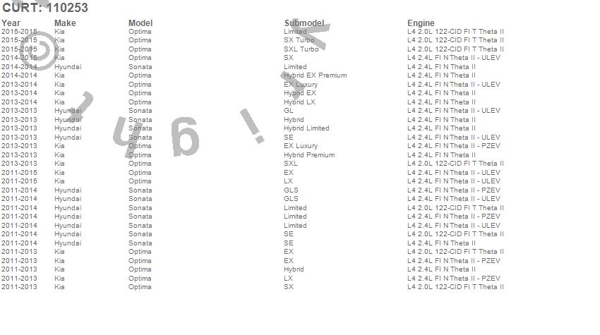 Below is an abbreviated list of applications for the Class I 1.25 in. Receiver Hitch.Optima, Sonata, Hyundai, Kia, 2015, 2014, 2013, 2012, 2011