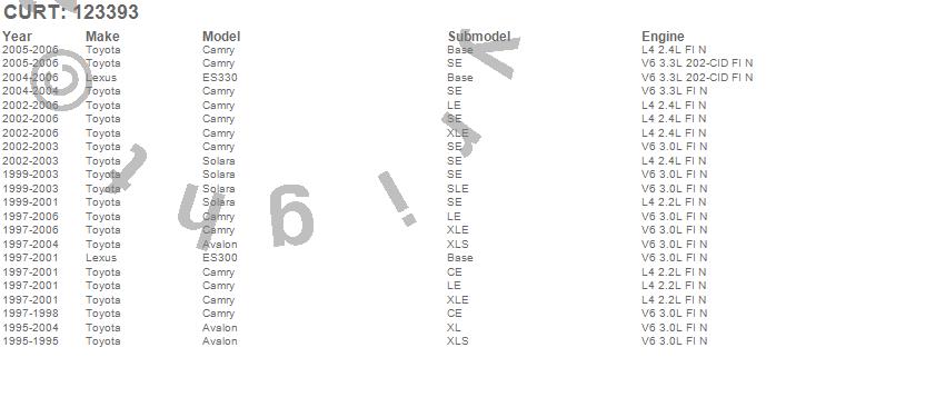 Below is an abbreviated list of applications for the Class II 1.25 in. Receiver Hitch.Avalon, Camry, ES300, ES330, Solara, Lexus, Toyota, 2006, 2005, 2004, 2003, 2002, 2001, 2000, 1999, 1998, 1997, 1996, 1995