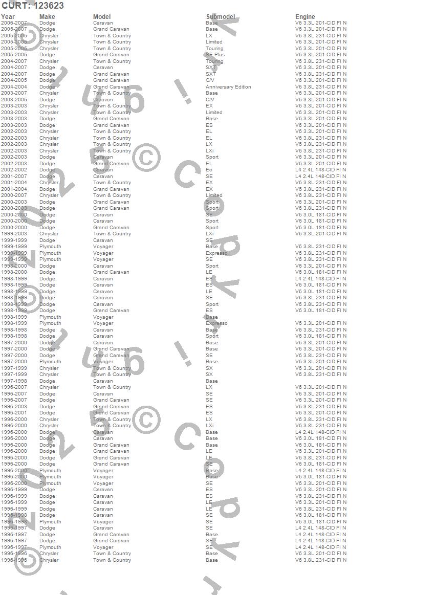 Below is an abbreviated list of applications for the Class II 1.25 in. Receiver Hitch.Caravan, Grand Caravan, Town & Country, Voyager, Chrysler, Dodge, Plymouth, 2007, 2006, 2005, 2004, 2003, 2002, 2001, 2000, 1999, 1998, 1997, 1996