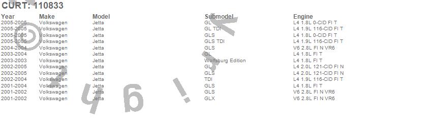 Below is an abbreviated list of applications for the Class I 1.25 in. Receiver Hitch.Jetta, Volkswagen, 2005, 2004, 2003, 2002, 2001
