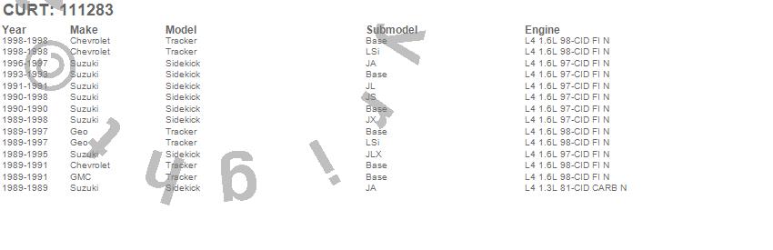 Below is an abbreviated list of applications for the Class I 1.25 in. Receiver Hitch.Sidekick, Tracker, Chevrolet, Geo, GMC, Suzuki, 1998, 1997, 1996, 1995, 1994, 1993, 1992, 1991, 1990, 1989