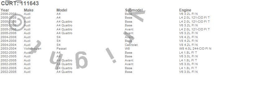 Below is an abbreviated list of applications for the Class I 1.25 in. Receiver Hitch.A4, A4 Quattro, Passat, S4, Audi, Volkswagen, 2008, 2007, 2006, 2005, 2004, 2003, 2002