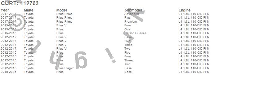 Below is an abbreviated list of applications for the Class I 1.25 in. Receiver Hitch.Prius, Prius Plug-In, Prius Prime, Prius V, Toyota, 2017, 2016, 2015, 2014, 2013, 2012, 2011, 2010