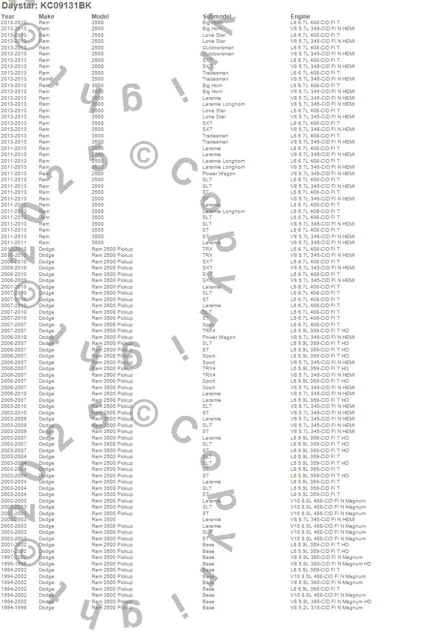 Below is an abbreviated list of applications for the Suspension System/Lift Kit.2500, 3500, Ram 2500, Ram 3500, Dodge, Ram, 2013, 2012, 2011, 2010, 2009, 2008, 2007, 2006, 2005, 2004, 2003, 2002, 2001, 2000