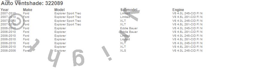 Below is an abbreviated list of applications for the Aeroskin Smoke Hood Protector.Explorer, Explorer Sport Trac, Ford, 2010, 2009, 2008, 2007, 2006