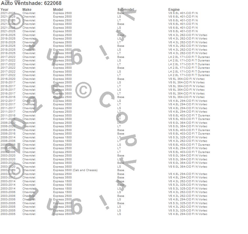 Below is an abbreviated list of applications for the Aeroskin Chrome Hood Protector.Express 1500, Express 2500, Express 3500, Express 3500 (Cab and Chassis), Chevrolet, 2025, 2024, 2023, 2022, 2021, 2020, 2019, 2018, 2017, 2016, 2015, 2014, 2013, 2012, 2011