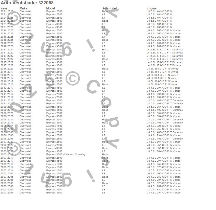 Below is an abbreviated list of applications for the Aeroskin Smoke Hood Protector.Express 1500, Express 2500, Express 3500, Express 3500 (Cab and Chassis), Express 4500, Chevrolet, 2025, 2024, 2023, 2022, 2021, 2020, 2019, 2018, 2017, 2016, 2015, 2014, 2013, 2012