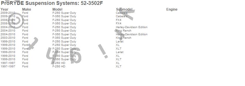Below is an abbreviated list of applications for the SuperBlok 3 In 1 Block and U-Bolt Kit.F-250 HD, F-250 Super Duty, F-350 Super Duty, Ford, 2010, 2009, 2008, 2007, 2006, 2005, 2004, 2003, 2002, 2001, 2000, 1999, 1997
