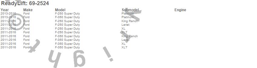 Below is an abbreviated list of applications for the SST Lift Kit.F-250 Super Duty, F-350 Super Duty, Ford, 2016, 2015, 2014, 2013, 2012, 2011
