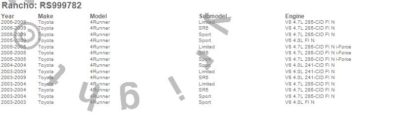 Below is an abbreviated list of applications for the Shock Absorber.4RUNNER, TOYOTA, 2009, 2008, 2007, 2006, 2005, 2004, 2003
