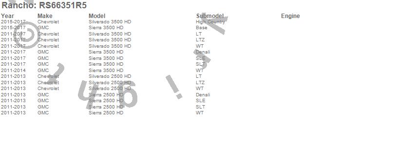 Brand: RanchoPart Number: RS66351R5Suspension Front Leveling Kit Type: Front RS5000 Series Shocks - 2.25 in. Lift - Fits Up To A 33-in. TireUPC: 039703004022