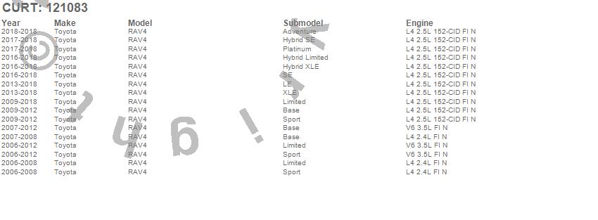 Below is an abbreviated list of applications for the Class II 1.25 in. Receiver Hitch.RAV4, Toyota, 2018, 2017, 2016, 2015, 2014, 2013, 2012, 2011, 2010, 2009, 2008, 2007, 2006