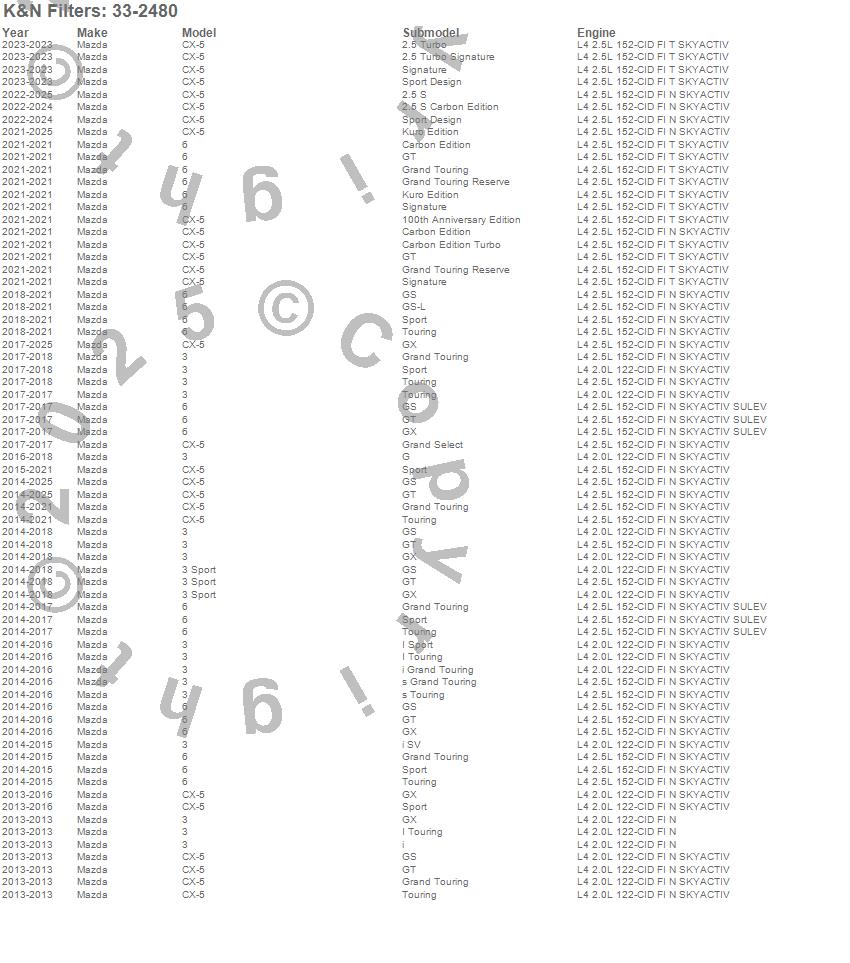 Below is an abbreviated list of applications for the Air Filter.3, 3 Sport, 6, CX-5, Mazda, 2019, 2018, 2017, 2016, 2015, 2014, 2013