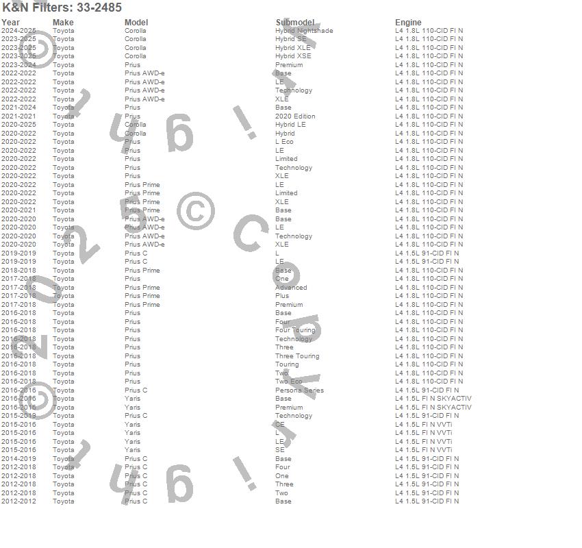 Below is an abbreviated list of applications for the Air Filter.Corolla, Prius, Prius C, Prius Prime, Yaris, Toyota, 2020, 2019, 2018, 2017, 2016, 2015, 2014, 2013, 2012