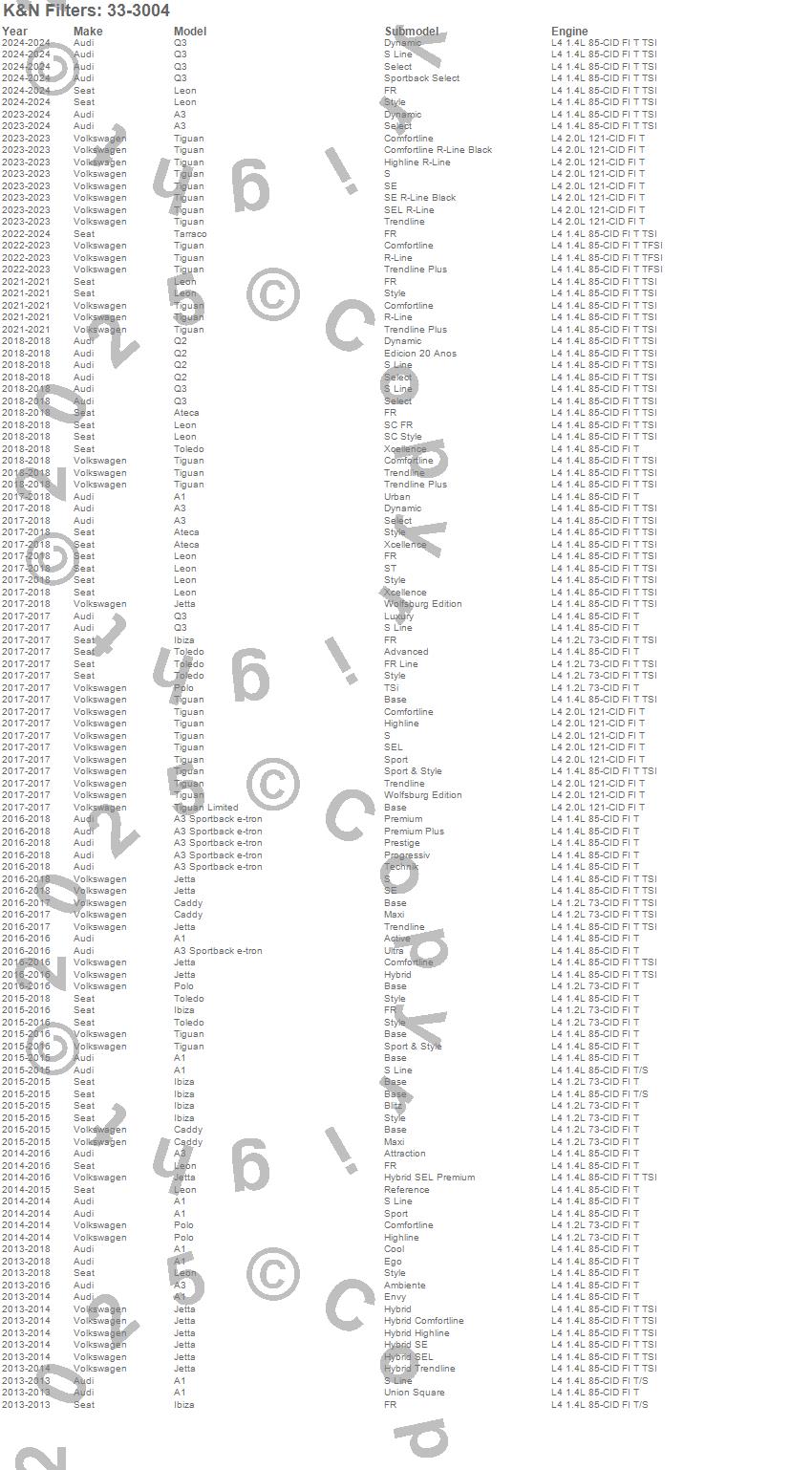 Below is an abbreviated list of applications for the Air Filter.A1, A3, A3 Sportback e-tron, Ateca, Caddy, Ibiza, Jetta, Leon, Polo, Q2, Q3, Tiguan, Toledo, Audi, Seat, Volkswagen, 2018, 2017, 2016, 2015