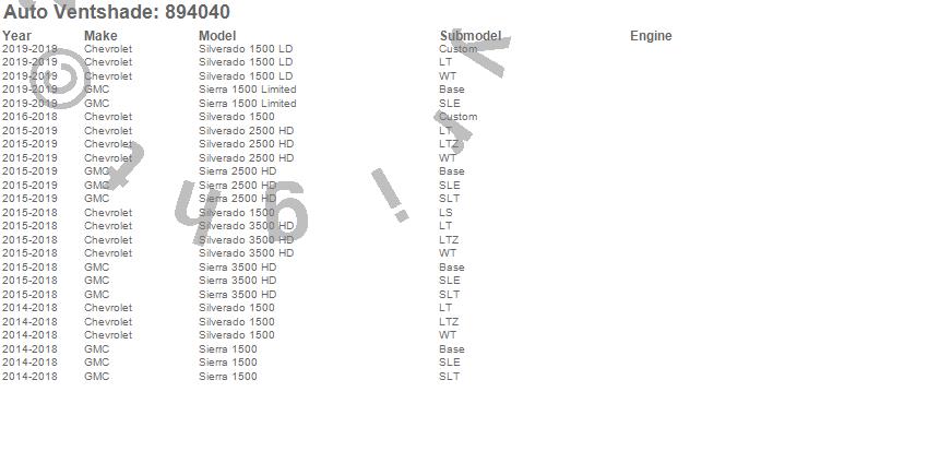 Below is an abbreviated list of applications for the Ventvisor Low Profile Deflector 4 pc..Sierra 1500, Sierra 1500 Limited, Sierra 2500 HD, Sierra 3500 HD, Silverado 1500, Silverado 1500 LD, Silverado 2500 HD, Silverado 3500 HD, Chevrolet, GMC, 2019, 2018, 2017, 2016, 2015, 2014