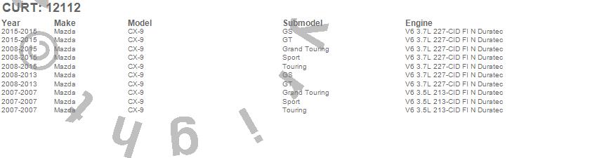 Below is an abbreviated list of applications for the Class II 1.25 in. Receiver Hitch.CX-9, Mazda, 2015, 2014, 2013, 2012, 2011, 2010, 2009, 2008, 2007
