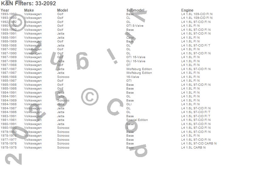 Below is an abbreviated list of applications for the Air Filter.Golf, Jetta, Scirocco, Volkswagen, 1993, 1992, 1991, 1990, 1989, 1988, 1987, 1986, 1985, 1984, 1983, 1982, 1981, 1980, 1979, 1978