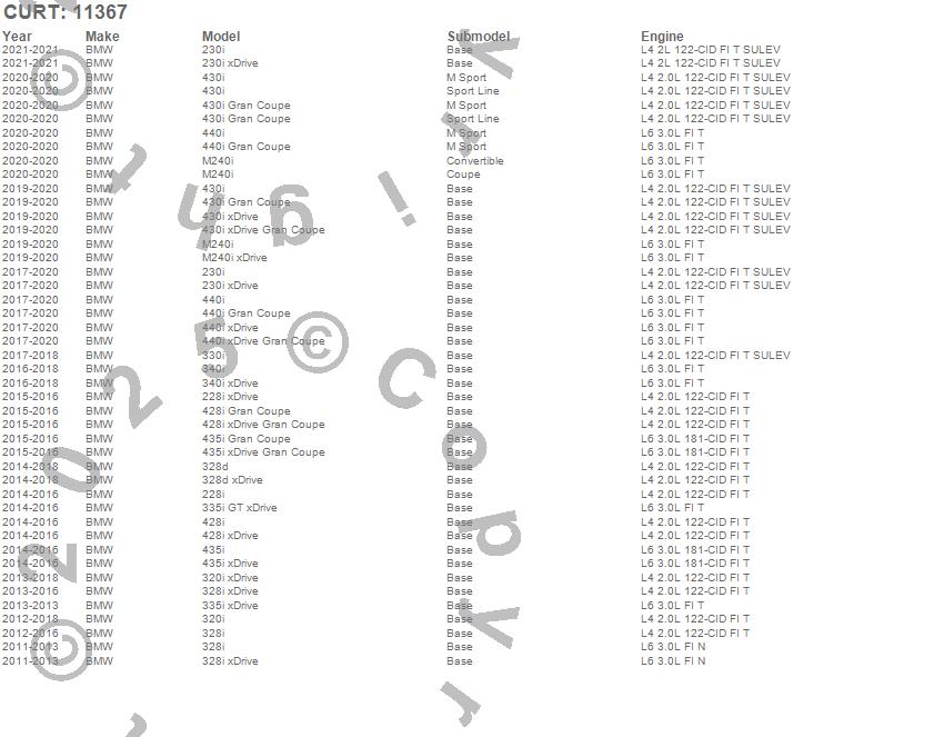 Below is an abbreviated list of applications for the Class I 1.25 in. Receiver Hitch.228i, 228i xDrive, 230i, 230i xDrive, 320i, 320i xDrive, 328d, 328d xDrive, 328i, 328i xDrive, 330i, 335i GT xDrive, 335i xDrive, 340i, 340i xDrive, 428i, 428i Gran Coupe, 428i xDrive, 428i xDrive Gran Coupe, 430i