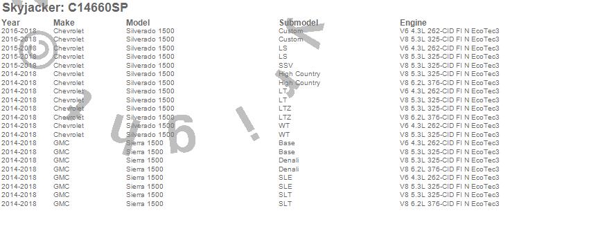 Brand: SkyjackerPart Number: C14660SPLift Kit; Rear Type: 6-7 in. LiftUPC: 803696216942