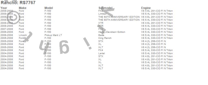 Below is an abbreviated list of applications for the RS7000MT Monotube Shock.F-150 PICKUP, F-150 PICKUP (Canadian), FORD, 2008, 2007, 2006, 2005, 2004