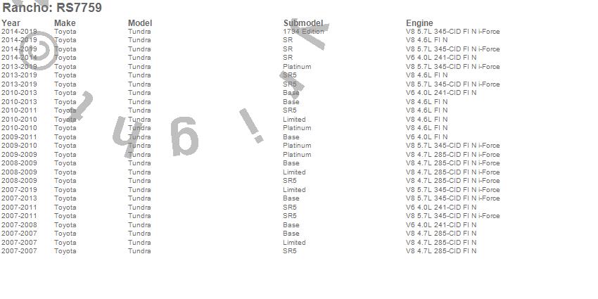 Below is an abbreviated list of applications for the RS7000MT Monotube Shock.TUNDRA, TUNDRA (Canadian), TOYOTA, 2011, 2010, 2009, 2008, 2007