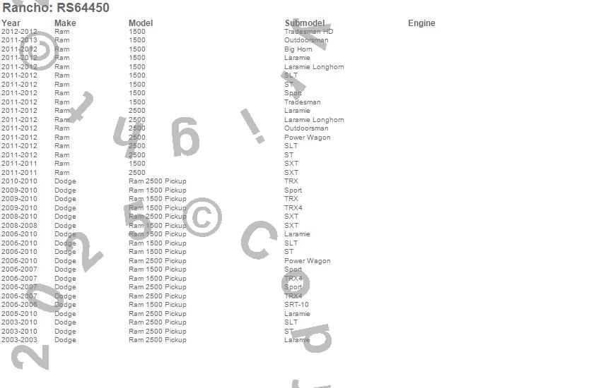 Below is an abbreviated list of applications for the Steering Stabilizer Bracket.1500, 1500 (Canadian), 2500, 2500 (Canadian), PICKUP 1500, RAM 1500 PICKUP, RAM 2500 PICKUP, DODGE, RAM, 2012, 2011, 2010, 2009, 2008, 2007, 2006, 2005, 2004, 2003