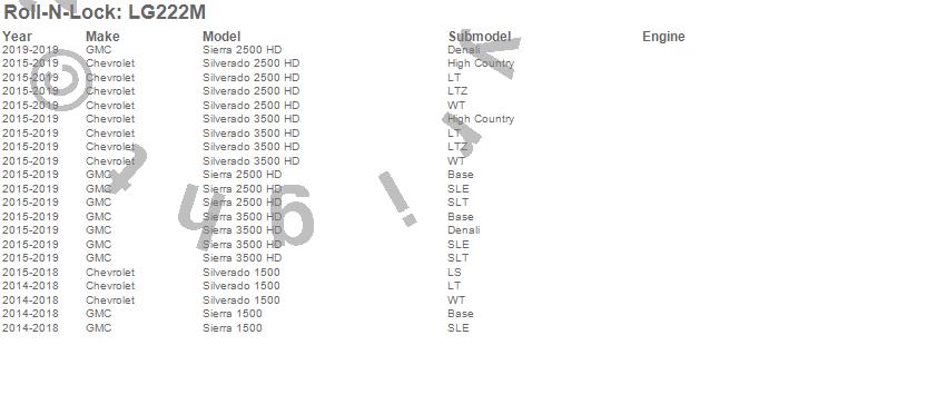 Below is an abbreviated list of applications for the Roll-N-Lock M-Series Truck Bed Cover.Sierra 1500, Sierra 2500 HD, Sierra 3500 HD, Silverado 1500, Silverado 2500 HD, Silverado 3500 HD, Chevrolet, GMC, 2019, 2018, 2017, 2016, 2015, 2014